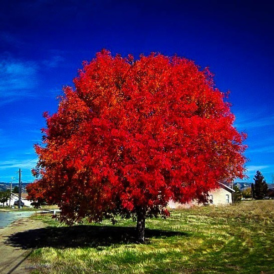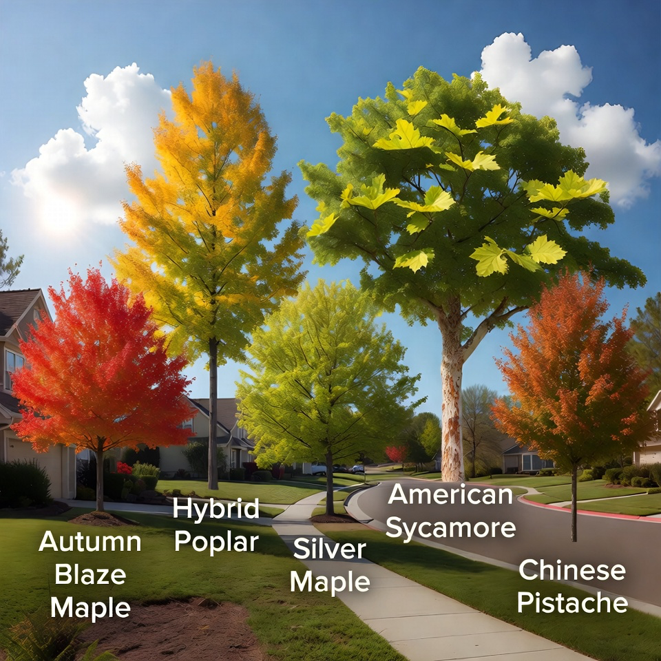 - Autumn Blaze Maple (Acer x freemanii 'Jeffersred') Growth Rate: 3-5 feet/year Mature Size: 40-50 feet tall, 30-40 feet wide Why it fits the South: Hybrid speed with heat/drought tolerance; stunning red fall color. Drawbacks: Early watering needed.